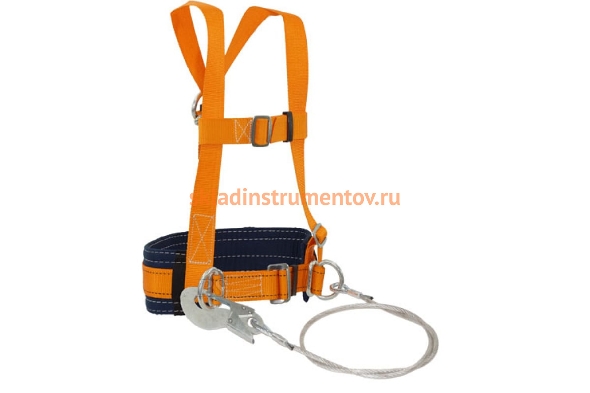 Система включает привязь с наплечными лямками (ремня с пряжкой, кушака, двух D-колец на поясе и одного на спине) и строп (металлический трос в ПВХ оболочке и монтажный карабин и крепежная петля).