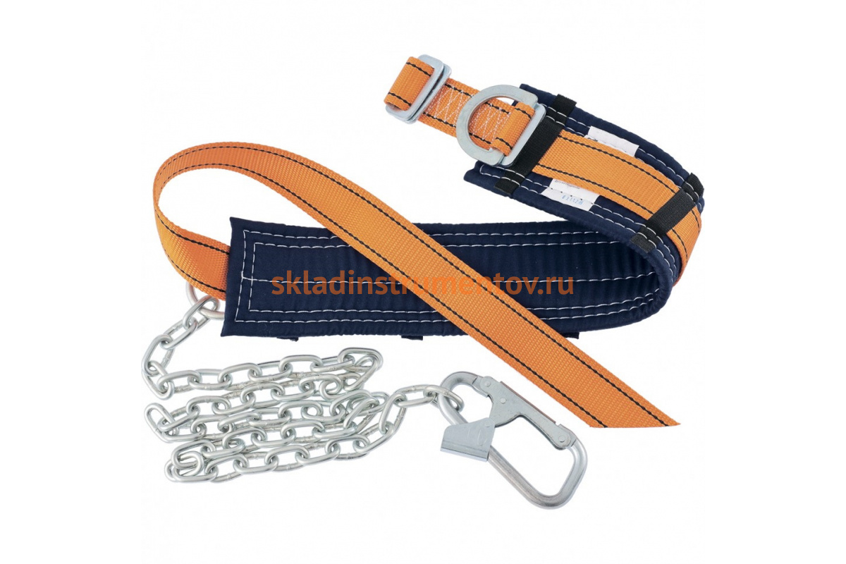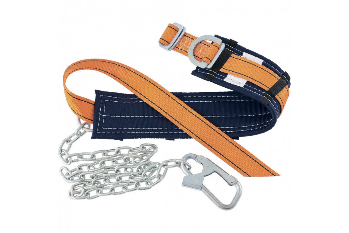 Состоит из предохранительного пояса, стропа из стальной цепи и монтажного карабина.