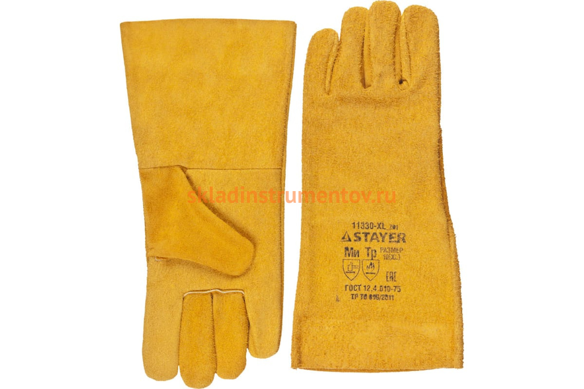 Термостойкие краги STAYER MASTER длина 350 мм 11330-XL_z*01 защищают руки от высоких температур, окалины и брызг горячего металла. Имеют размер XL. При изготовлении использовался спилок, который обладает износостойкими свойствами. Удлиненная и жёсткая манжета прикрывает область запястья. Длина краг: 35 см.