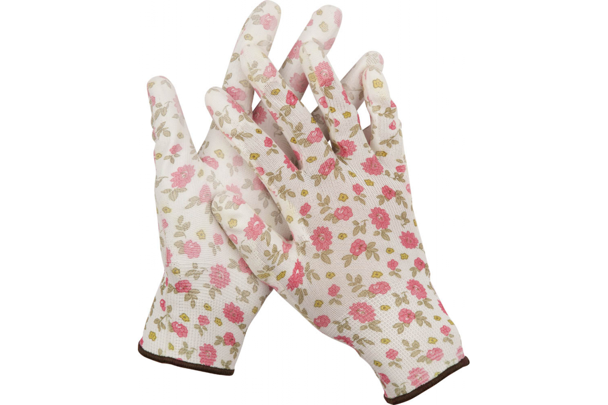 Садовые перчатки Grinda прозрачное PU покрытие, 13 класс вязки, бело-розовые, размер S 11291-S имеют высокую устойчивость к загрязнениям и влаге во время работ на садовом участке.