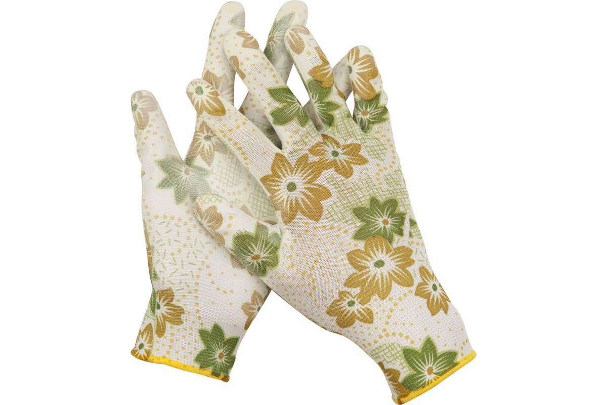 Садовые перчатки Grinda, прозрачное PU покрытие, 13 класс вязки, бело-зеленые, размер S 11293-S имеют высокую устойчивость к загрязнениям и влаге во время работ на садовом участке.