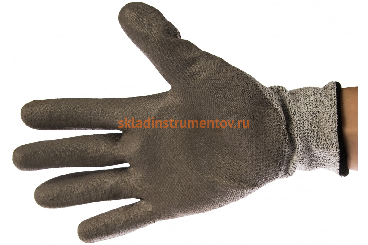 Перчатки выполнены из прочного ПЭВД-волокна. Внутренняя поверхность ладони и кончиков пальцев имеет плотное полиуретановое покрытие, которое повышает устойчивость к истиранию. Рабочие инструменты, благодаря покрытию, не выскальзывают из рук.