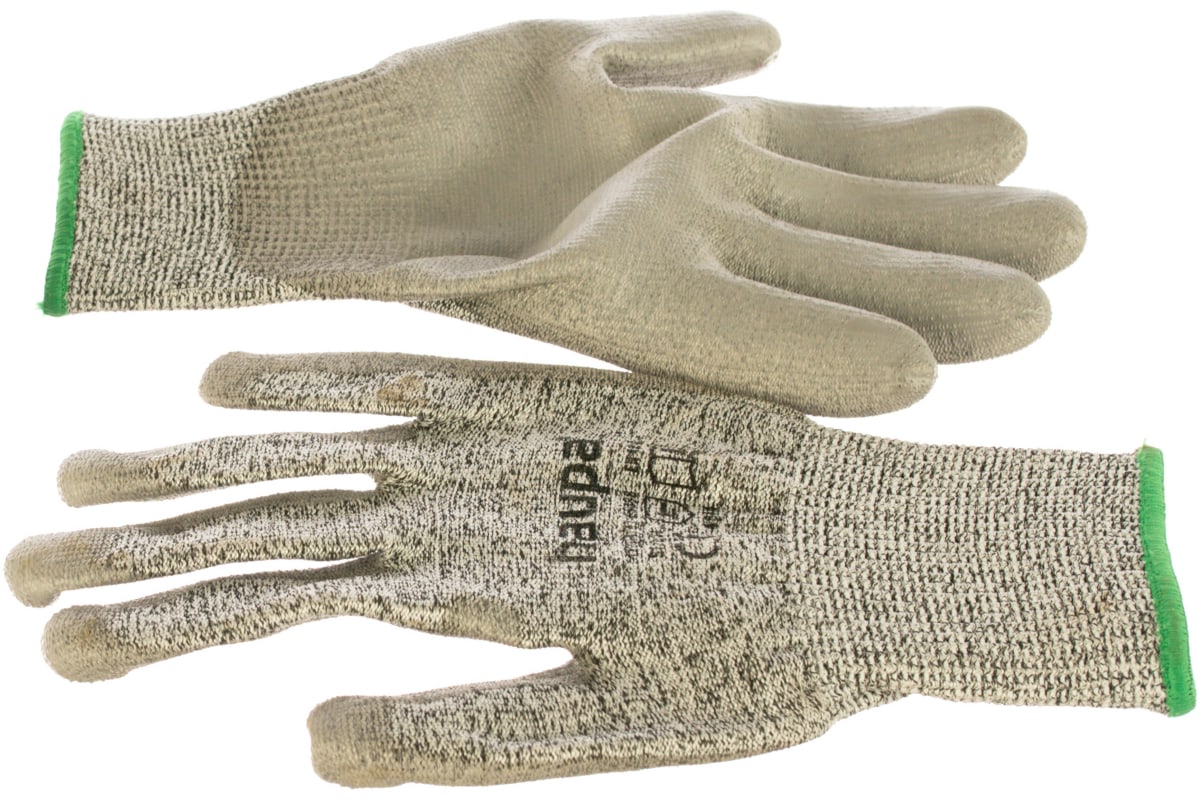 Перчатки выполнены из прочного ПЭВД-волокна. Внутренняя поверхность ладони и кончиков пальцев имеет плотное полиуретановое покрытие, которое повышает устойчивость к истиранию. Рабочие инструменты, благодаря покрытию, не выскальзывают из рук.