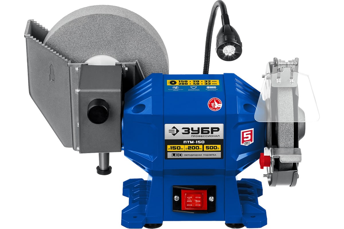 Заточной станок для мокрого и сухого шлифования ЗУБР d150/d200 мм, 500 Вт, ПТМ-150 предназначен для заточки, а также влажной и сухой шлифовки инструмента и металлических заготовок.