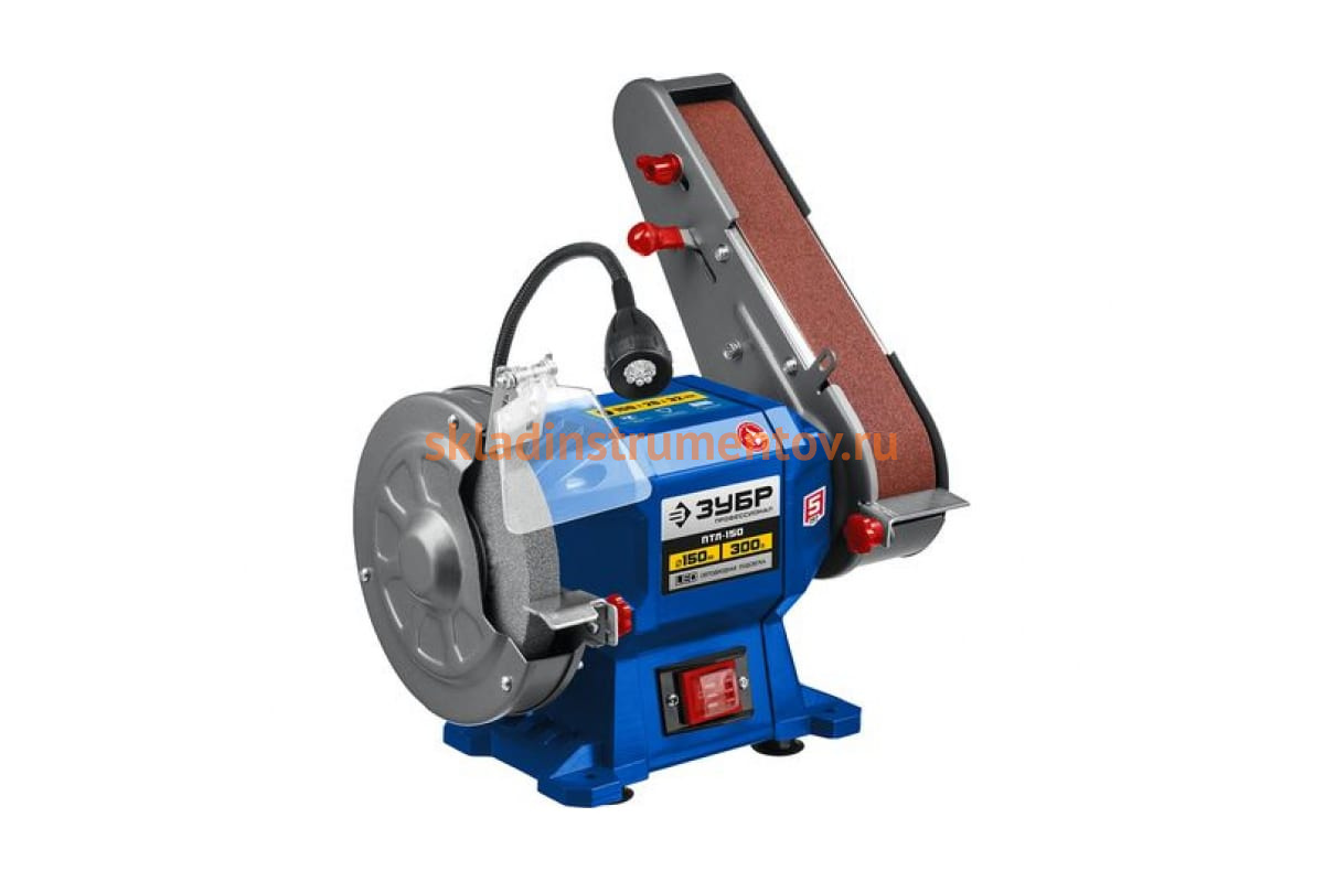Заточной станок с шлифовальной лентой ЗУБР d150 мм, 300 Вт, ПТЛ-150 используется для заточки и шлифовки инструмента и металлических заготовок.