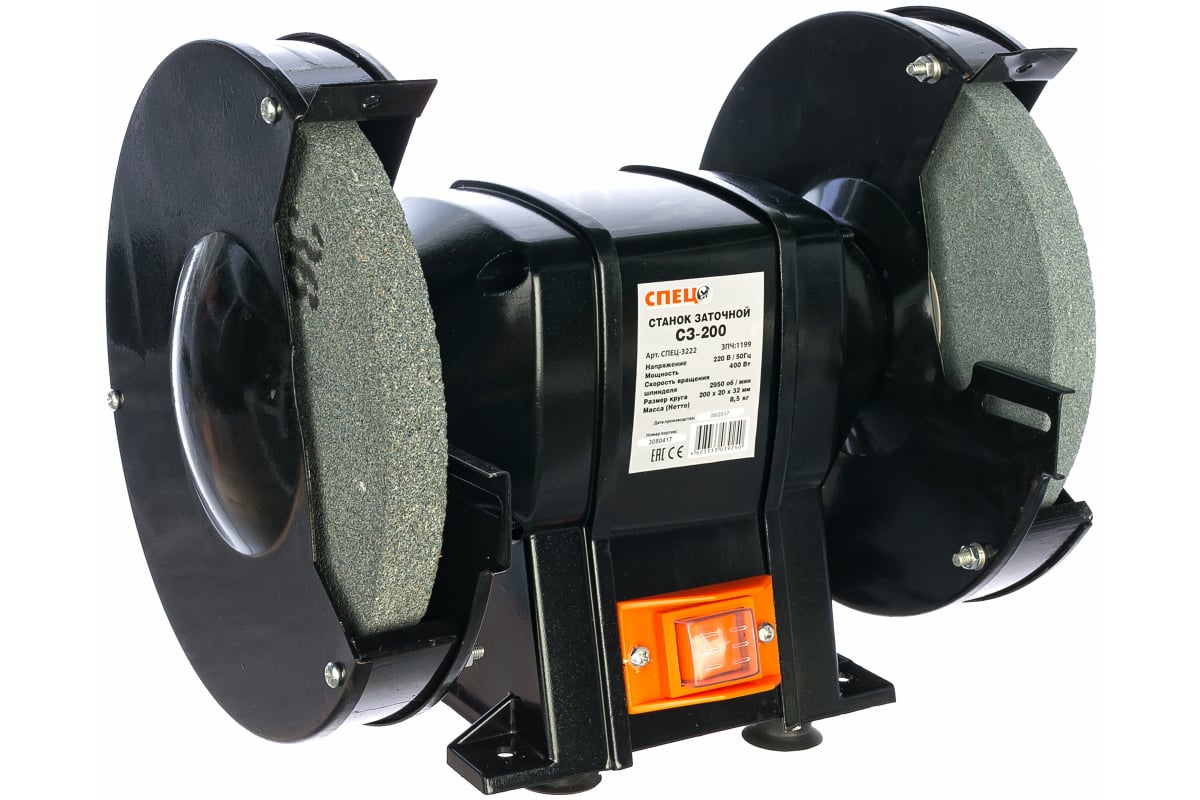 Заточной станок СПЕЦ СЗ-200 отличается малым потреблением электрической энергии и высокой безопасностью эксплуатации. Изделие предназначено для обточки и шлифовки различных предметов, а также заточки режущего инструмента. Кнопка включения защищена от пыли и влаги. Вращающиеся круги прикрывают металлические кожухи, к которым прикреплены опоры для удобства фиксации заготовок при точении. Станок прост в использовании и не требует специального ухода, достаточно только отряхнуть его от пыли.