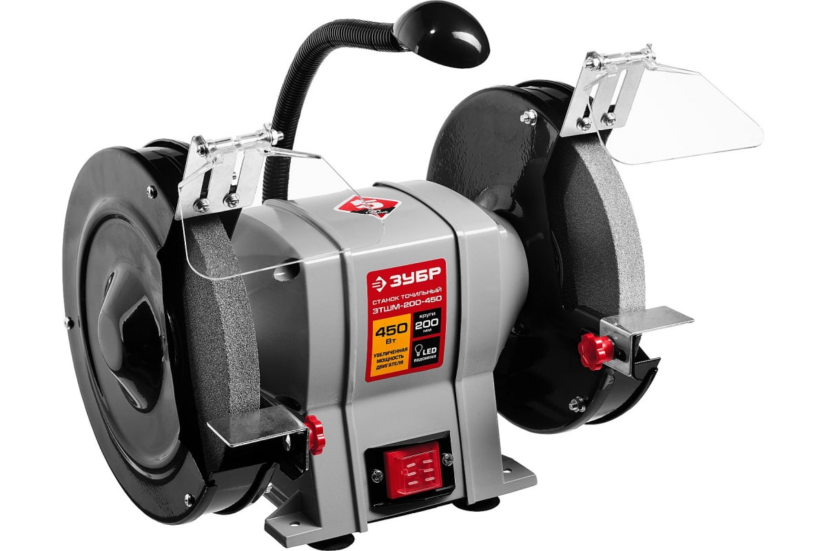 Двойной точильный станок ЗУБР ЗТШМ-200-450 применяется как в быту, так и в небольших столярных мастерских. Модель позволяет качественно и быстро затачивать режущие поверхности инструментов. Оснасткой выступают круги диаметром 200 мм (2 камня уже входят в стандартный комплект поставки). Стабильная частота вращения дисков способствует эффективности агрегата в работе. Плафон лампы местного освещения гарантирует точное направление светового потока в зону шлифования.