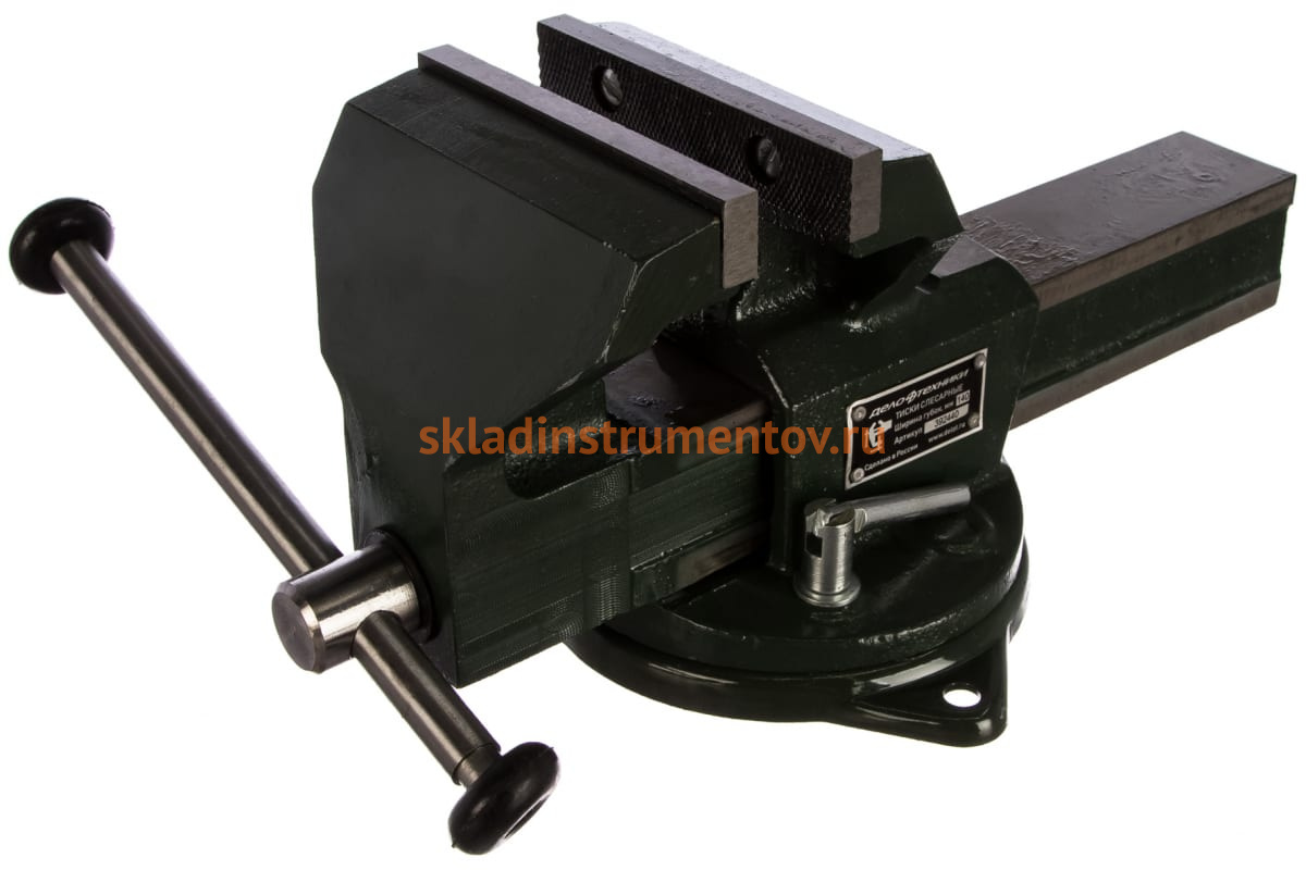 Слесарные поворотные тиски Дело Техники ТСС-140 392440 применяются для зажима металлических деталей перед обработкой. Благодаря отверстиям основания модель легко и просто фиксируется на верстаке. Поворотная рукоять выполняет функцию рычага и позволяет приводить тиски в действие без приложения существенных усилий.