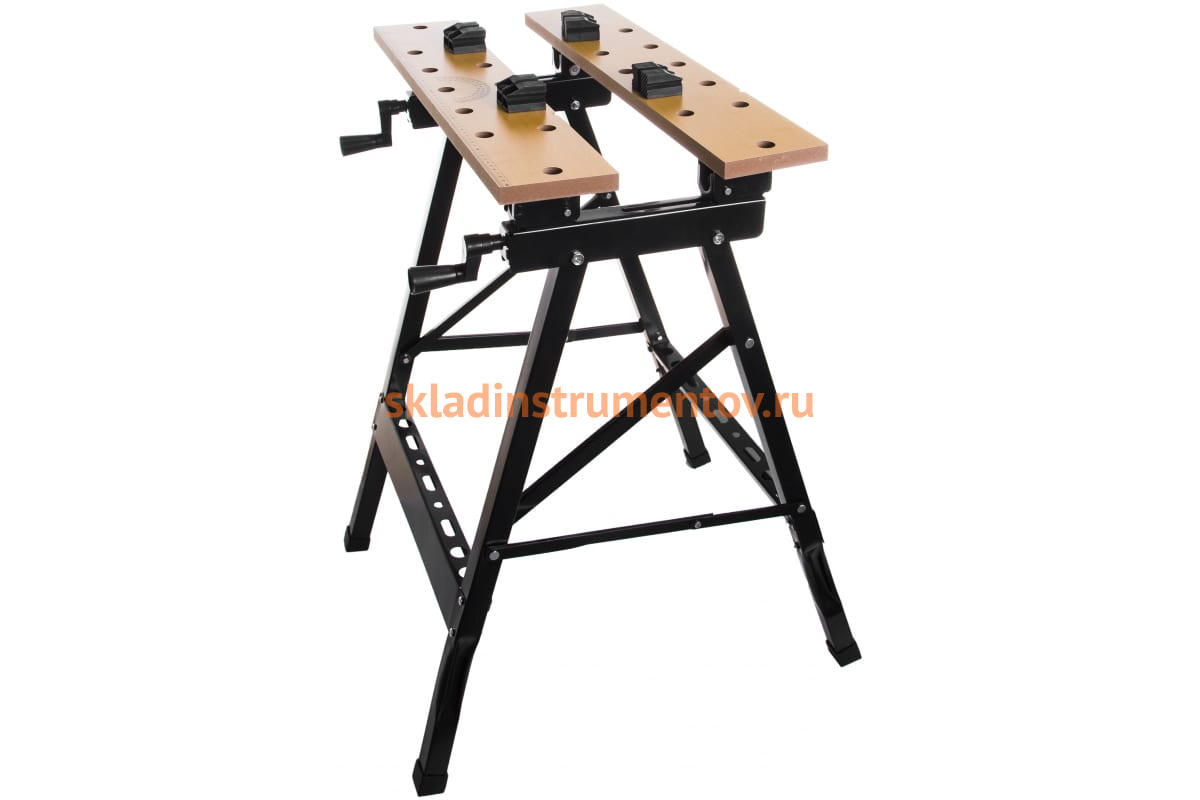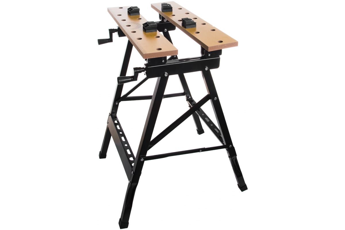 Складной верстак Энкор 14218 - многофункциональное устройство для облегчения обработки различных заготовок. Столешница состоит из двух частей, которые поворачиваются на фиксированные углы 45 и 90 градусов, что делает возможным фиксацию круглых заготовок. Верстак легко хранить и перевозить, благодаря складной конструкции. Предусмотрены отверстия в столешнице для надежной фиксации заготовок. Зажим деталей до 260 мм.