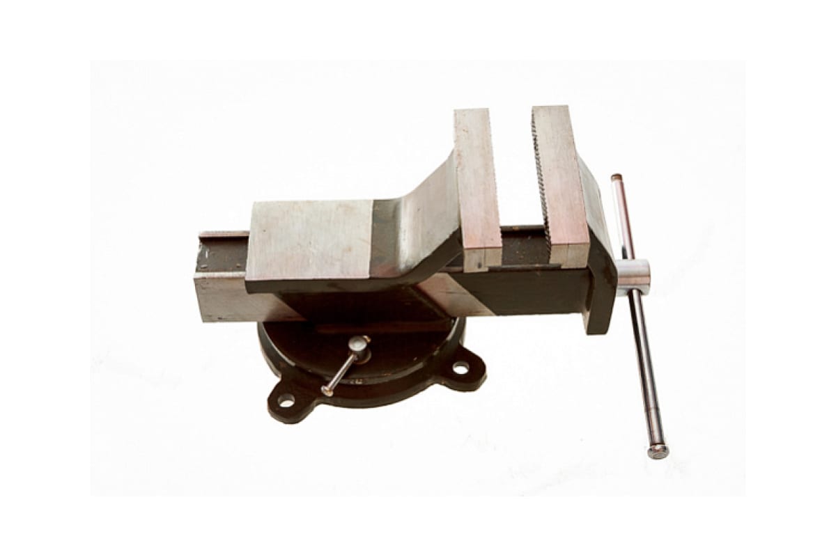 Слесарные поворотные тиски Дело Техники ТСС-125 392425 представляет собой зажимное устройство для фиксации труб и прочих элементов в условиях слесарной мастерской. Пазы основания позволяют жестко крепить приспособление к верстаку. Прочная конструкция отличается долговечностью.