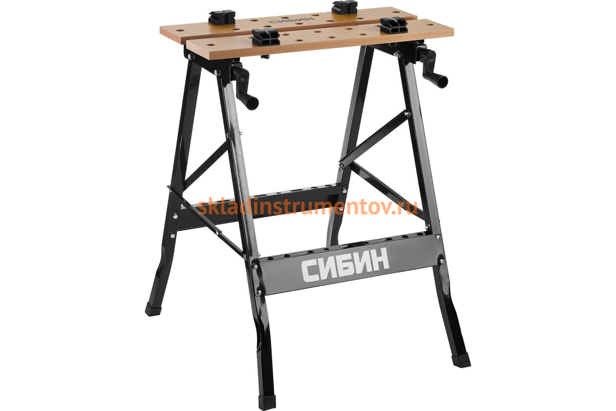 Столярный верстак СИБИН складной 38723 состоит из двух частей (подвижная и неподвижная) и используется при выполнении небольших столярных и слесарных работ в мастерской, гараже. Положение подвижной части можно регулировать с помощью двух вращающихся рукояток.
