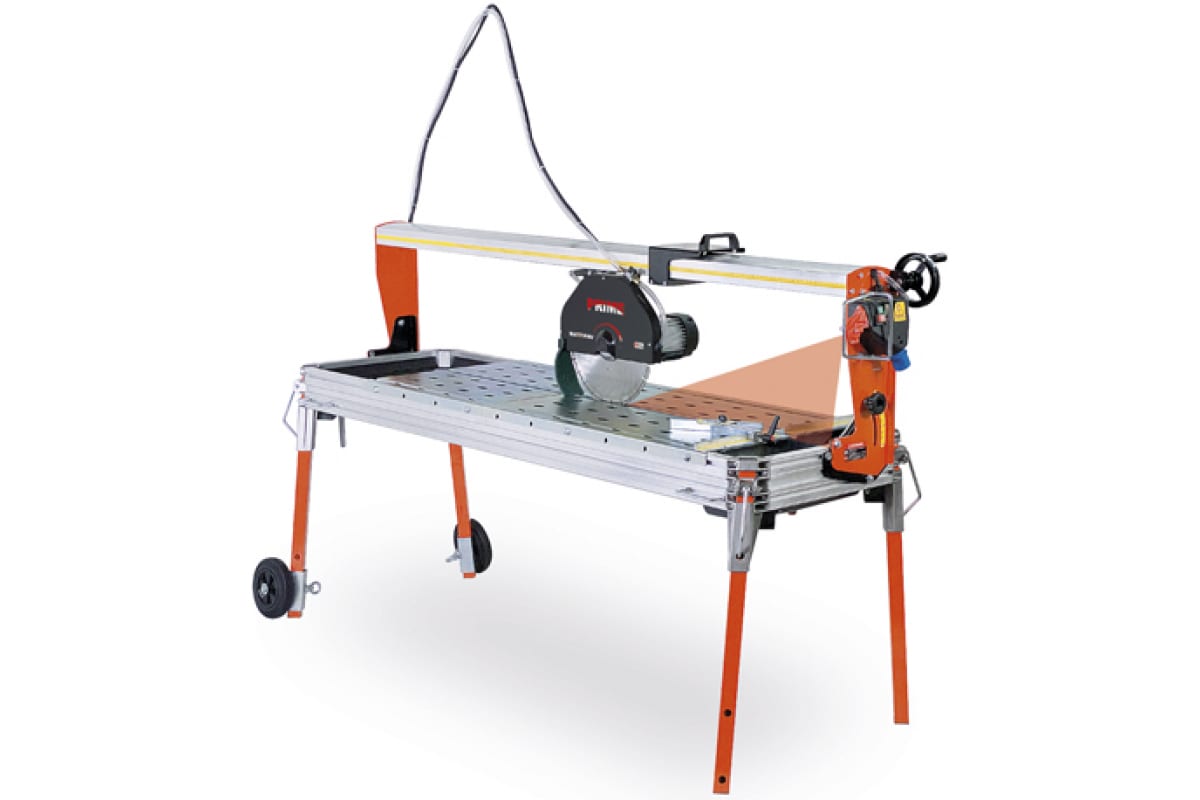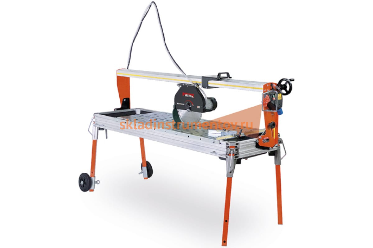 Модель оснащена подвижным рабочим столом и плавающей режущей головкой. Высота режущего диска регулируется вращением маховика и соответствующего рычага фиксации положения. Наличие колес и ручек обеспечивают удобную транспортировку станка внутри рабочей зоны.