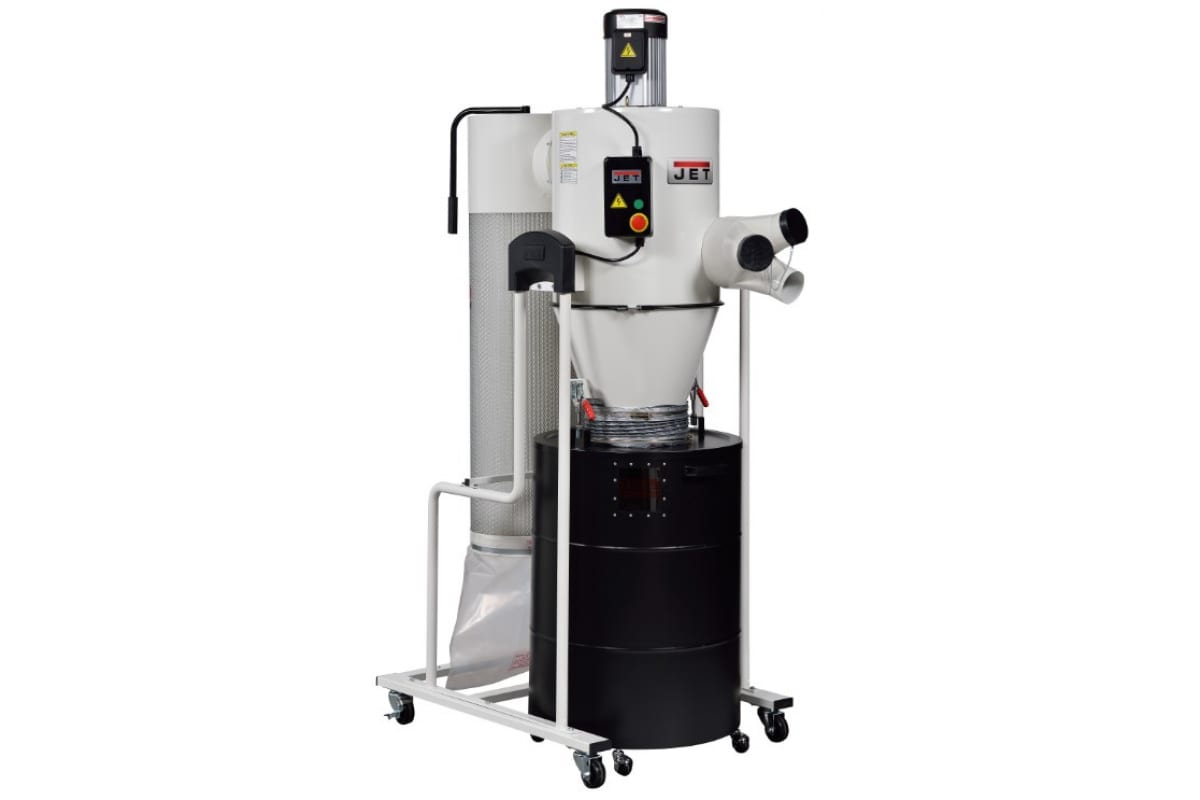 Вытяжная установка Циклон JET JCDC-3 717530KT обеспечивает эффективное удаление пыли и крупной стружки из рабочей зоны деревообрабатывающих станков. В зависимости от работы с/без штуцера-разветвителя подключение оборудования осуществляется к одному патрубку диаметром 200 мм или к трем патрубкам диаметром 100 мм каждый. Благодаря пульту (питание 2хААА, 1.5 В) есть возможность дистанционно координировать работу агрегата. Выходная мощность двигателя составляет 2200 Вт. Установка работает с разрежением воздуха 1700 Па. Пылесборный мешок фиксируется при помощи специальной оправки и устанавливается на диаметр 620 мм. Тонкость фильтрации равняется 2 мкм. Общая площадь фильтра - 4.2 м2. Стальная крыльчатка диаметром 380 мм с радиальным расположением лопастей отличается устойчивостью к повреждениям и износу. Рама конструкции выполнена из стальной трубы.