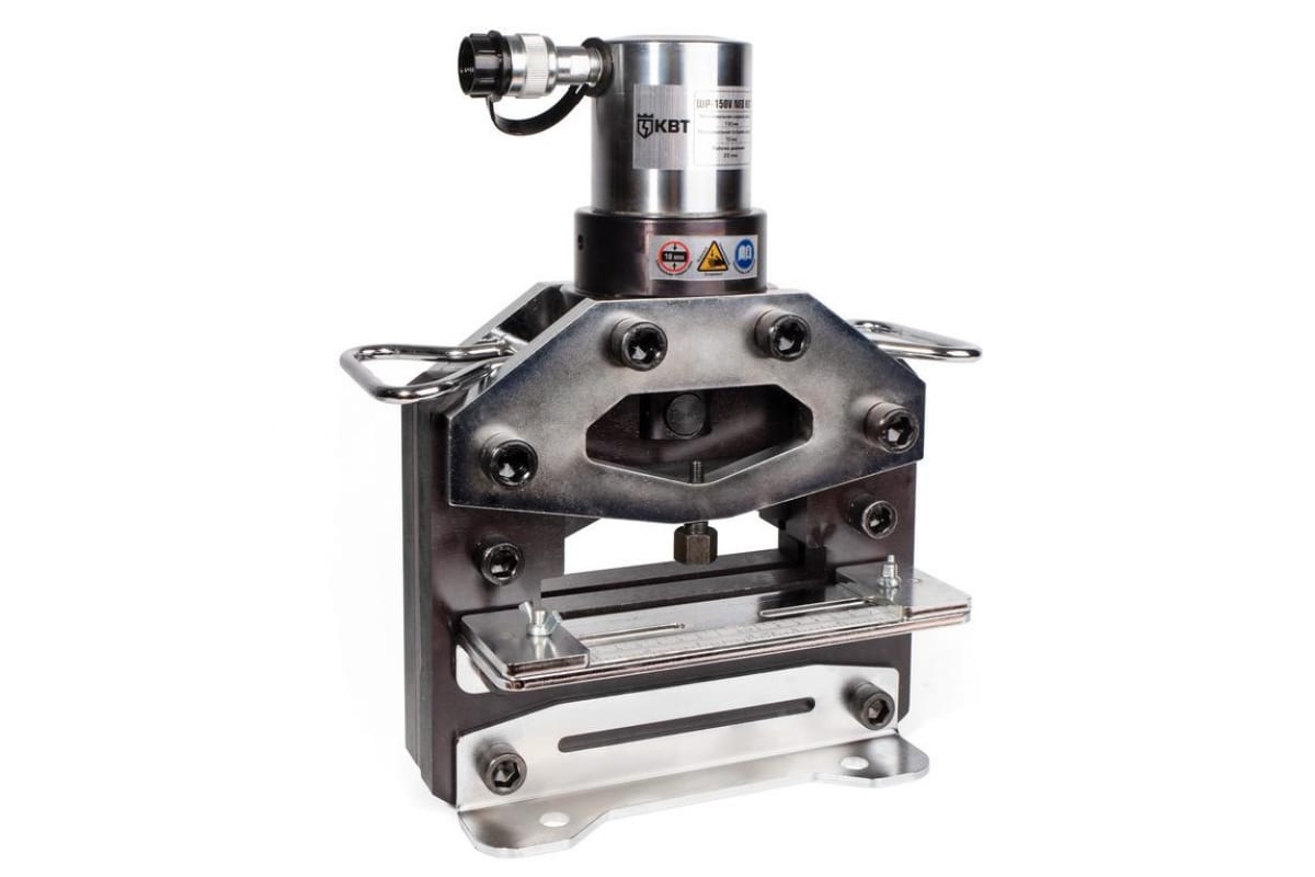 Гидравлический шинорез КВТ ШР-150V NEO 76504 предназначается для реза токоведущих деталей. Модель оснащается двумя типами лезвий - прямым и гильотинным с высечкой. Центрирующая планка обеспечивает надежную фиксацию шины. Максимальная толщина пробиваемого материала - 10 мм для меди и алюминия, для стали - 6 мм.