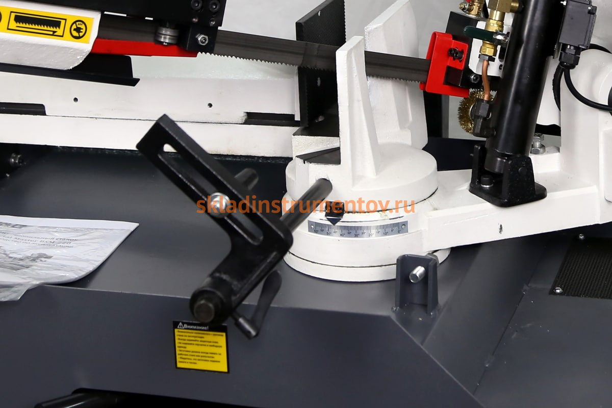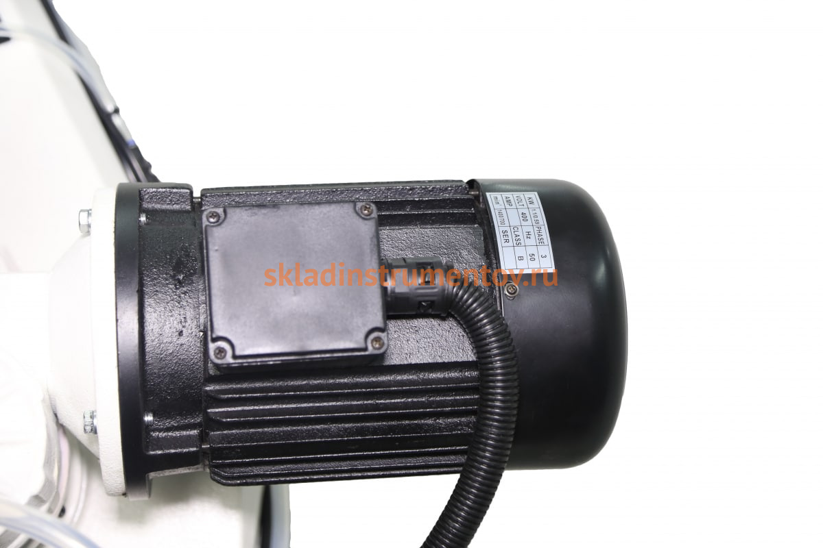 Привод осуществляется мотор-редуктором с асинхронным двигателем мощностью 1.1 кВт. Чугунное основание обеспечивает необходимую жесткость конструкции и поглощает рабочие вибрации в процессе пиления.