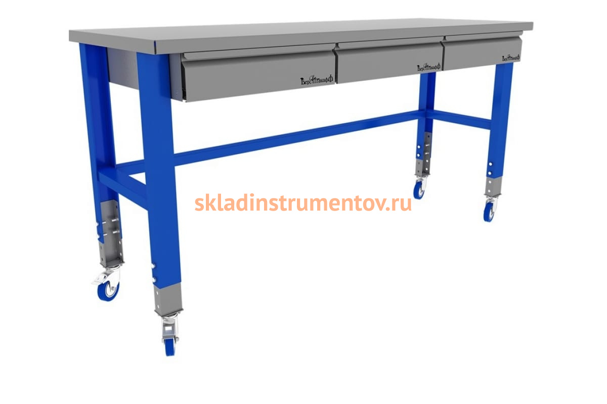Промышленный металлический стол на колесах 2000 мм Верстакофф PROFFI 115013 имеет три выдвижных ящика, за счет чего увеличена рабочая поверхность. Длина столешницы составляет 2000 мм. Совместно со столом возможно использовать подкатные инструментальные тележки Верстакофф серии 795 (опционально). Стол способен выдерживать нагрузку до 700 кг. Столешница выполнена из листовой стали толщиной 2 мм. Каркас сварной, изготовлен из профилированной листовой стали, толщина 1 мм. Засчет специальной конструкции опор можно проводить регулировку стола по высоте (800 - 1000 мм).