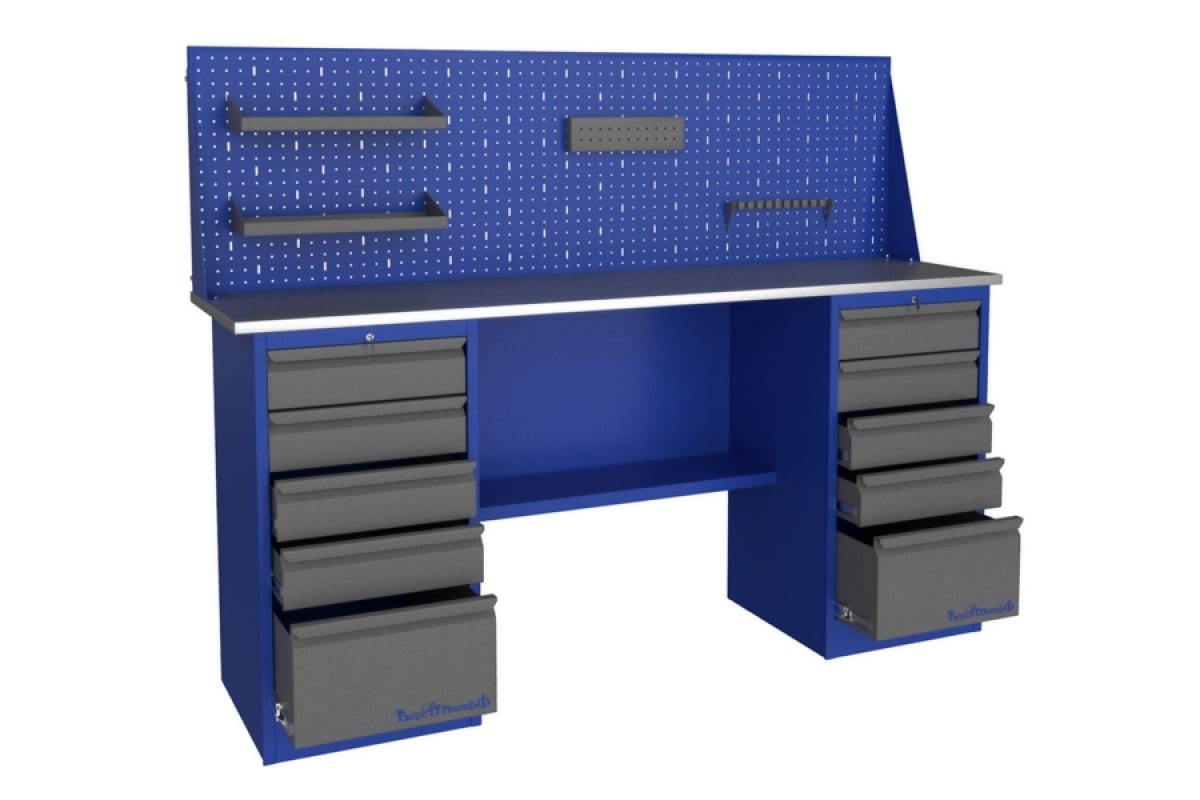Верстак Верстакофф PROFFI-E 218 Д5 Д5 Э 116011 имеет две тумбы, по пять ящиков в каждой. Тумбы закрываются на центральный замок. Столешница имеет длину рабочей поверхности, равную 1800 мм. Материал столешницы - качественная фанера, покрытая оцинкованным металлом. Верстак применяется в гараже, мастерской, небольшом обучающем центре для организации рабочего места. Благодаря наличию дополнительных поверхностей на приспособлении можно разместить большое количество инструмента, как объемного, так и небольшого. Столешница выдерживает нагрузку до 200 кг. Верстак окрашен порошковой краской.