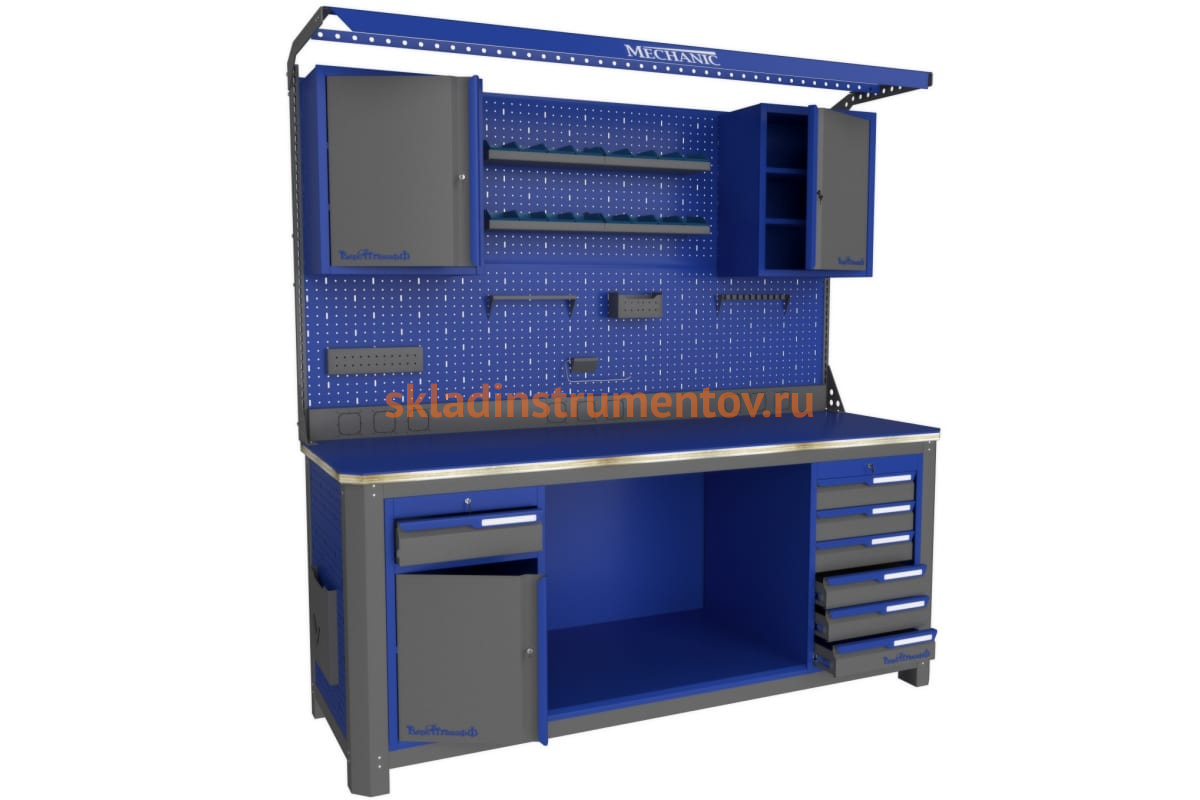 Рабочее место Верстакофф MECHANIC №201 114108 предназначается для мебелирования слесарной мастерской, автосервиса. В комплект поставки входит козырек с лампой освещения, что дает возможность выполнять технические операции в помещениях с дефицитом света. Габаритные инструменты легко размещаются на полке-стенке или в модуле с дверцей. Длинная столешница (2000 мм) позволяет обрабатывать крупногабаритные детали и заготовки.