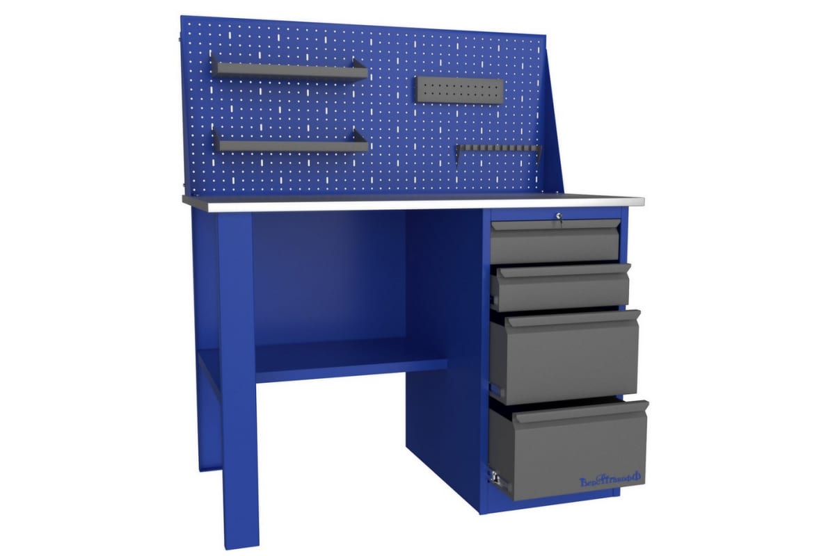 Верстак Верстакофф PROFFI 112 Д4Э 101203 - прочная конструкция, которая предназначается для профессионального применения. Стол широко эксплуатируется на промышленных предприятиях, в слесарных мастерских или в образовательных учреждениях. Столешница изготавливается из фанеры с покрытием из листового метала и способна выдержать значительную нагрузку. Экран оснащается тумбами с полочками для хранения различных мелких деталей.