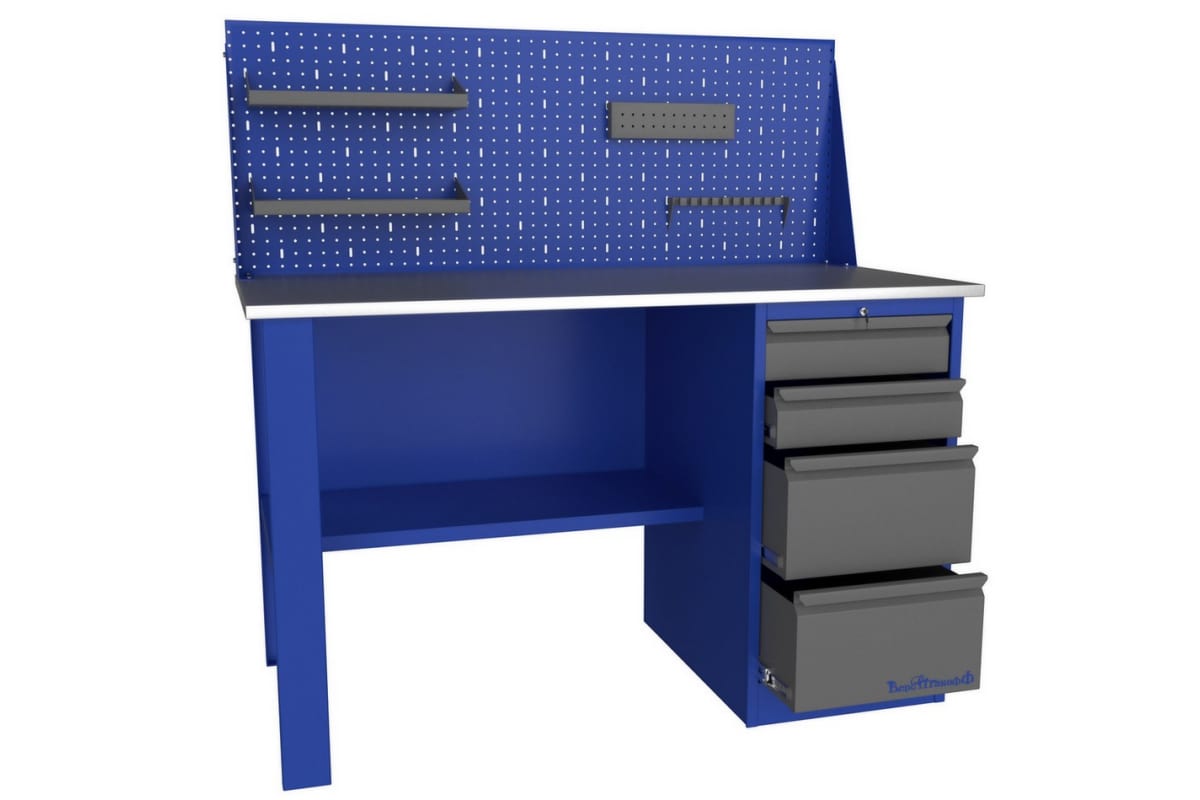 Верстак Верстакофф PROFFI 114 Д4 Э 101209 предназначается для организации рабочего места в слесарной мастерской. Экран позволяет дополнительно устанавливать полочки для хранения инструментов и различных мелких деталей. Под столешницей находится дополнительная полка для инструментов.