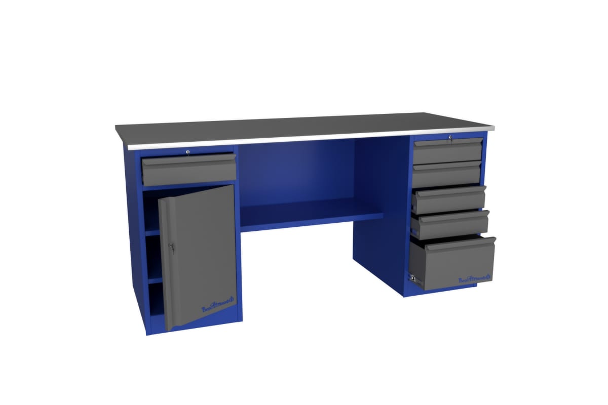 Верстак Верстакофф PROFFI 218 Т1 Д5 101257 разработан для проведения разнообразных столярных работ. Преимуществом изделия является наличие прочной столешницы, толщина которой составляет 24 мм. Рабочая поверхность покрыта миллиметровым листом металла. Наличие двух тумб упрощает систематизацию хранения оборудования. Разноплановые тумбы позволяют оптимизировать хранение рабочего инструмента. Дополнительная область хранения - нижняя полка, которая позволяет своевременно очищать рабочую зону.