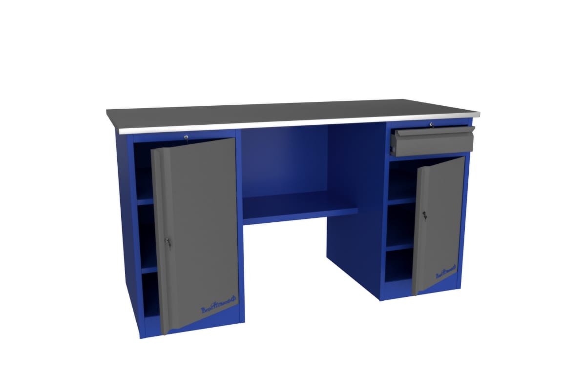 Верстак Верстакофф PROFFI 218 Т Т1 101282 разработан для проведения разнообразных столярных работ. Преимуществом изделия является наличие прочной столешницы, толщина которой составляет 24 мм. Рабочая поверхность покрыта миллиметровым листом металла. Наличие двух тумб упрощает систематизацию инструмента. Пространство внутри тумбы разделено полками на несколько частей, что также удобно для складирования электроинструмента больших размеров. Нижняя полка позволяет размещать инструмент непосредственно в течение рабочего дня, освобождая рабочую зону.