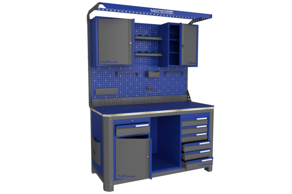 Рабочее место Верстакофф MECHANIC №151 114103 применяется в автомастерских, гаражах, производственных цехах. В комплект поставки входит козырек с лампой освещения, что дает возможность выполнять операции в помещениях с дефицитом света. Большая длина (1500 мм) и стальное покрытие столешницы обеспечивают устойчивость к высоким нагрузкам. Крупные инструменты легко размещаются в полке-стенке или в модуле с дверцей.