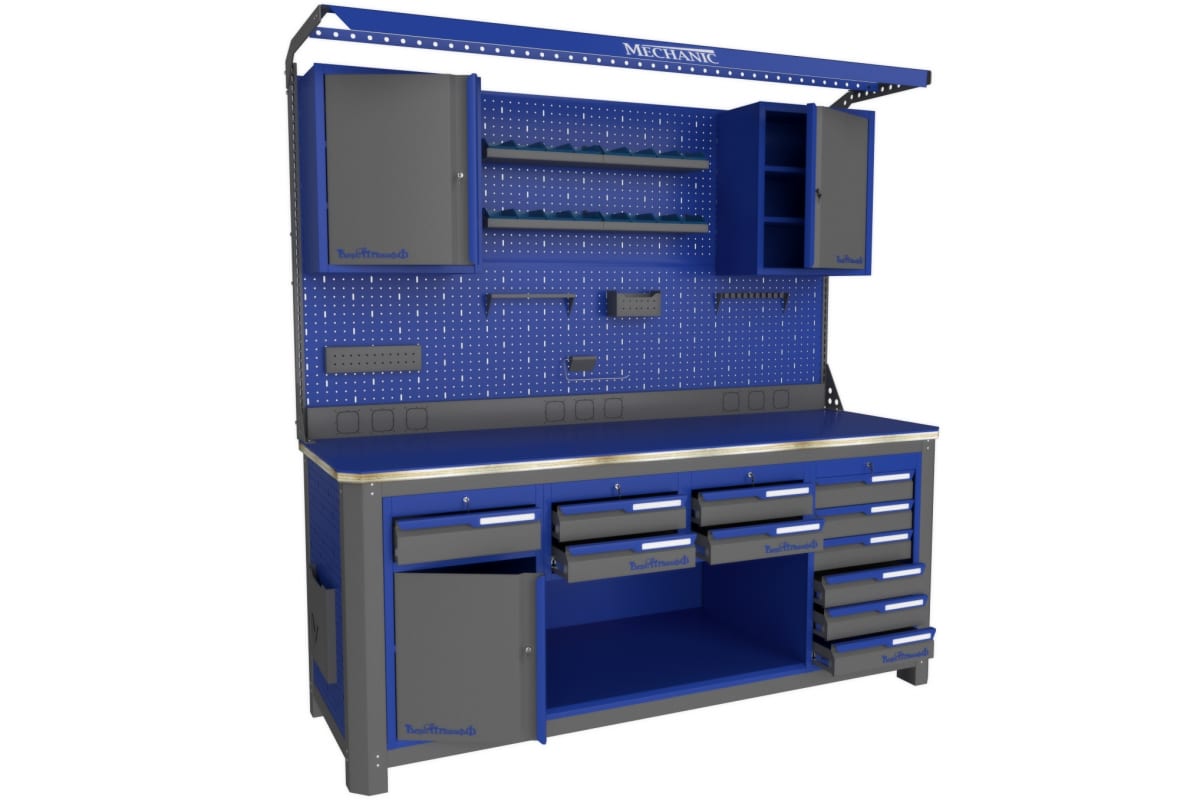 Рабочее место Верстакофф MECHANIC №202 114109 предназначается для мебелирования слесарной мастерской, автосервиса, производственного цеха. В комплект поставки входит козырек с лампой освещения, что дает возможность выполнять технические операции в помещениях с дефицитом света. Двухметровая столешница из фанеры и стали устойчива к износу, выдерживает нагрузки до 3 тонн. Верстак отличается простотой сборки, долговечностью и вместительностью.