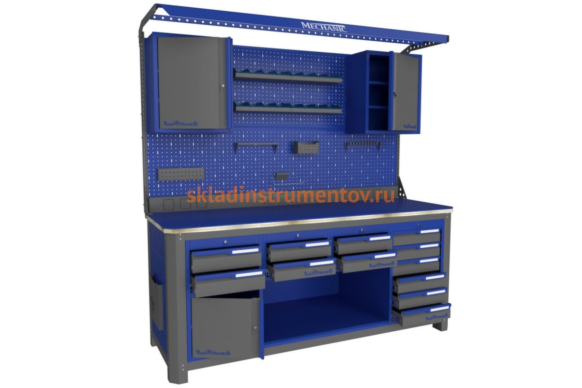 Рабочее место Верстакофф MECHANIC №203 114110 предназначается для мебелирования слесарной мастерской, автосервиса, производственного цеха. В комплект поставки входит козырек с лампой освещения, что дает возможность выполнять технические операции в помещениях с дефицитом света. Модель отличается простотой сборки, функциональностью, устойчивостью к износу. Полка-стенка служит для временного размещения крупногабаритного инструмента и оснастки.
