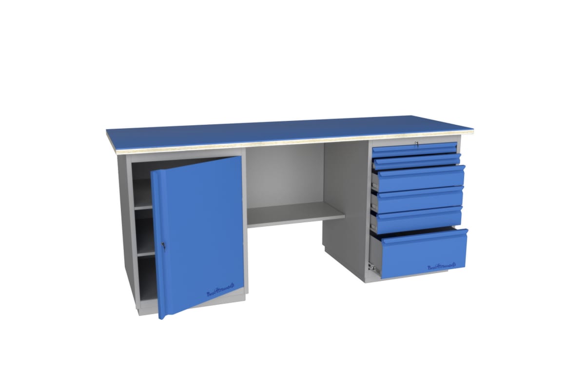 Верстак Верстакофф GRAND 2000 Т Д6 117040 позволяет с удобством организовать одно рабочее место в слесарной мастерской. Модель имеет прочную и устойчивую конструкцию для выполнения тяжелых работ, например, отпиливание, рубка или резка и другое. Верстак оснащается износоустойчивой столешницей из фанеры толщиной 24 мм со стальным покрытием. Множество ящиков, которые запираются на ключ, способствуют удобному и упорядоченному хранению документации или ценных вещей. Стол отличается вместительностью и простотой сборки.