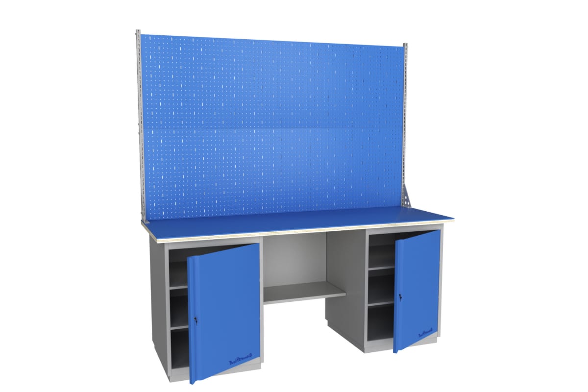 Верстак Верстакофф GRAND 2000 Т Т Э2 117032 позволяет уверенно производить различные технологические операции в слесарной мастерской или производственном цеху. Столешница изготавливается из фанеры с покрытием из листового метала и обладает устойчивость к износу. Стол оснащается двумя тумбами для хранения в необходимой очередности документов или мелких деталей. Дополнительная полка внизу стола подходит для размещения рабочего инструмента или личных вещей оператора.