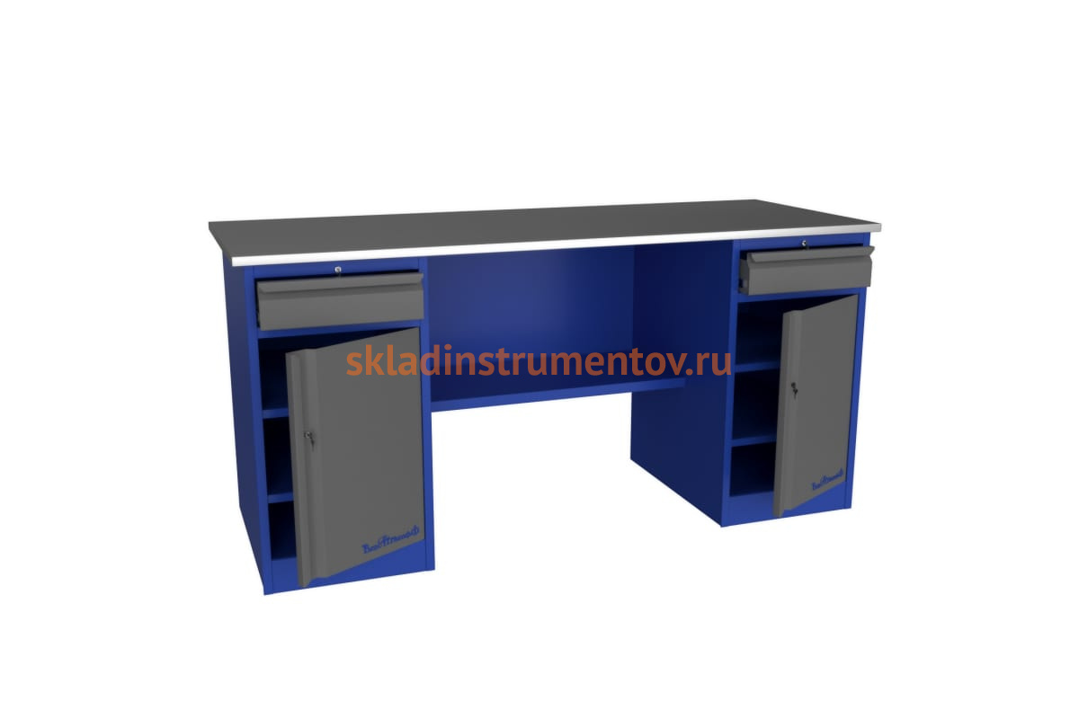 Верстак Верстакофф PROFFI 218 Т1 Т1 101284 разработан для проведения разнообразных столярных работ. Преимуществом изделия является наличие прочной столешницы, толщина которой составляет 24 мм. Металлическое покрытие обеспечивает длительный срок службы и увеличивает максимальную нагрузку. Две тумбы с дверцами позволяют хранить большое количество инструмента. Центральный замок на каждой тумбе повышает безопасность хранения. Между тумбами располагается полка с задней стенкой, удобная для складирования инструмента во время рабочего дня.
