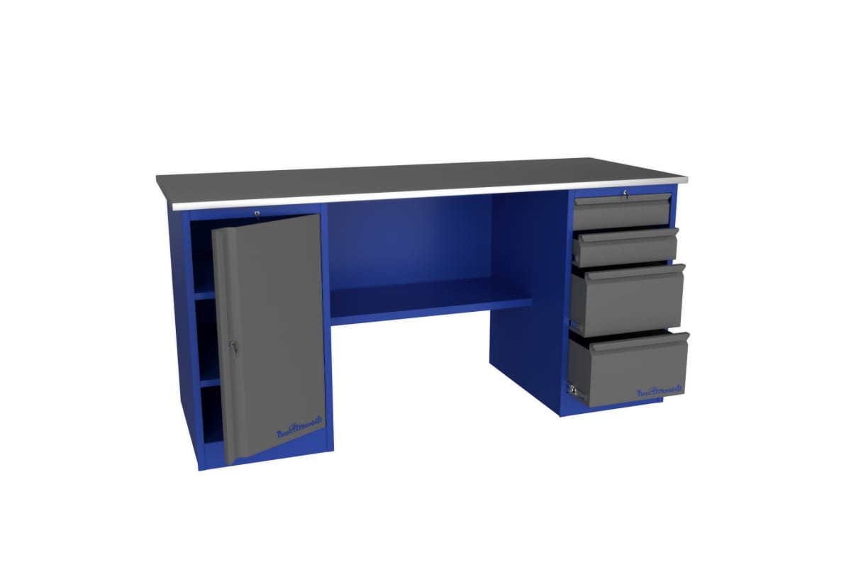 Верстак Верстакофф PROFFI 218 Т Д4 101247 разработан для проведения разнообразных столярных работ. Преимуществом изделия является наличие прочной столешницы, толщина которой составляет 24 мм. Рабочая поверхность покрыта миллиметровым металлом. Наличие двух тумб упрощает систематизацию хранения оборудования. Конструкция имеет достаточную прочность. Дополнительную безопасность в работе обеспечивает наличие центрального замка на каждой тумбе. Внизу расположена полка с задней стенкой.