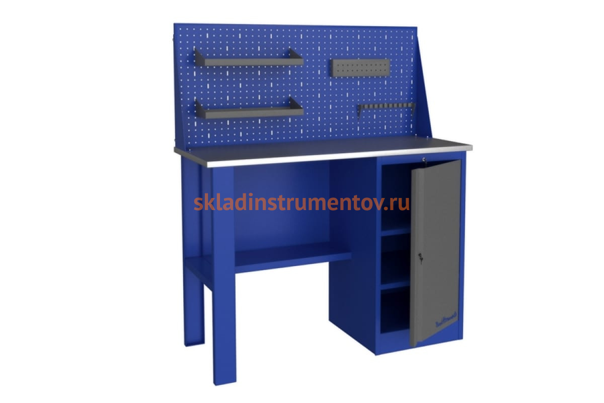 Верстак Верстакофф PROFFI-E 112 Т Э 116003 имеет столешницу длиной 1200 мм. Столешница выполнена из фанеры и покрыта оцинкованным металлом. Конструкция верстака окрашена порошковой краской, что исключает истирание поверхностей. Данное приспособление пригодится в гараже, мастерской, небольшом обучающем центре для организации рабочего места. В конструкции верстака предусмотрена тумба с дверцей, внутри две полки. Благодаря наличию дополнительных поверхностей на приспособлении можно разместить большое количество инструмента, как объемного, так и небольшого. Столешница выдерживает нагрузку до 200 кг.
