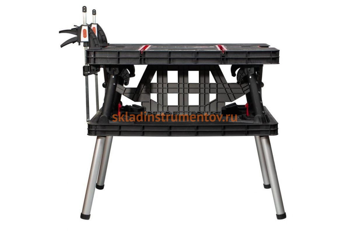 Складная конструкция модели быстро приводится в рабочее положение благодаря специальным фиксаторам. Рабочий стол выдержит нагрузку до 453 кг. Модель не доставляет сложностей в транспортировке, есть удобная ручка для переноски.