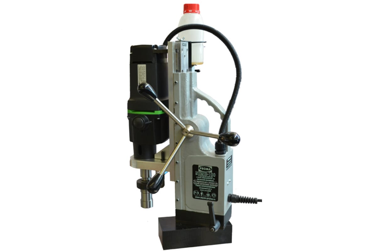Сверлильно-резьбонарезной станок на поворотном магнитном основании PROMA MDMR-100 1001000 - это профессиональное оборудование, которое широко используется в сфере металлообработки. Данная модель позволяет формировать отверстия в металлических заготовках диаметром до 100 мм (спиральным сверлом - от 3 до 32 мм, корончатым - от 12 до 100 мм). Мощный немецкий электропривод обеспечивает высокую производительность и гарантирует плавный ход сверлильной головки. Поворотное магнитное основание дает возможность сверлить близко расположенные отверстия, не изменяя местоположение самого станка. Наличие бака с СОЖ обеспечивает отличное качество работы и увеличивает срок службы сверла.