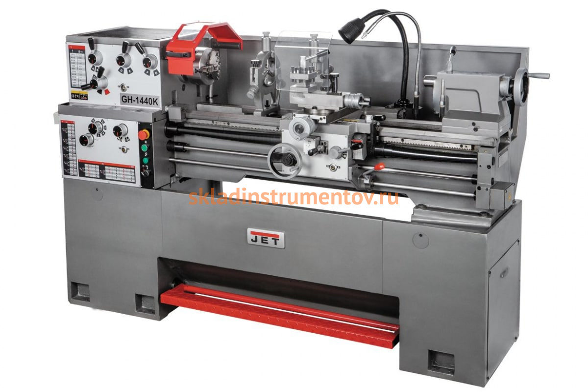 Токарный станок по металлу, 400 В JET GH-1440K 50000916T используется для обтачивания металлических заготовок и нарезания различных видов резьб. Для этого оборудование оснащается современными точными системами подачи.