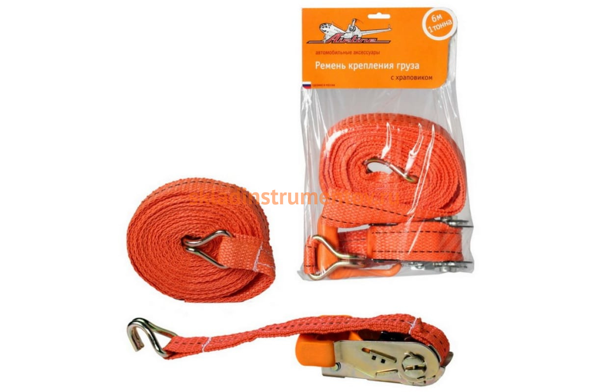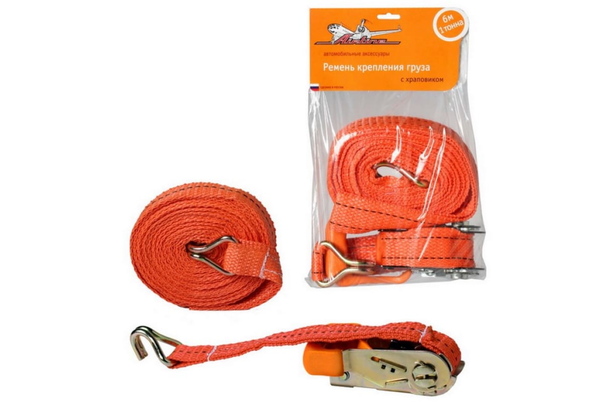 Ремень крепления груза с храповиком (6 м, 1 т) Airline AS-T-04 не меняет своих характеристик под воздействием мороза или влажности. Стальные крюки и храповик выдерживают нагрузку до 1000 кг. Прочная полиэфирная нить ремня не вступает в реакцию с техническими веществами (масло, бензин и прочие),а также мало подвержена истиранию, что увеличивает срок службы приспособления.
