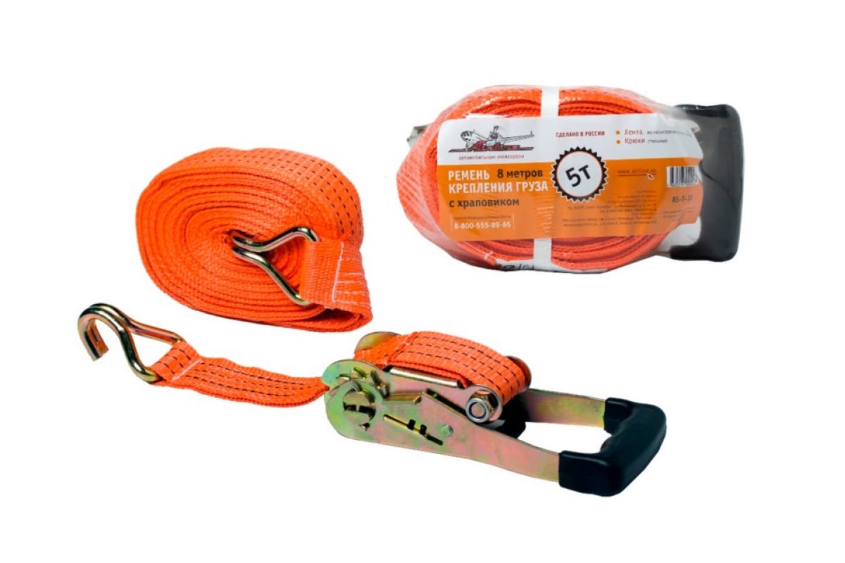 Ремень крепления груза с храповиком (8 м, 5 т) Airline AS-T-10 выдерживает эксплуатацию в тяжелых условиях - при низкой температуре окружающей среды, обилии влаги, наличии разрушающих химических веществ, трении. Материалом ленты служит полиэфирная нить, крюка и храпового механизма - сталь.