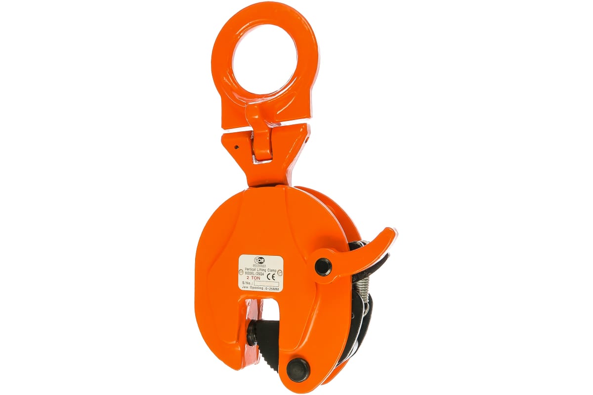 Вертикальный поворотный захват TOR DSQA Tor 12225 предназначен для фиксации, подъема и перемещения грузов. Оснастка состоит из корпуса и фиксирующего элемента. Поднятый груз удерживается в вертикальной плоскости при помощи трения нажимного языка о поверхность груза. Вертикальный захват имеет грузовое крепление в виде круглого отверстия.