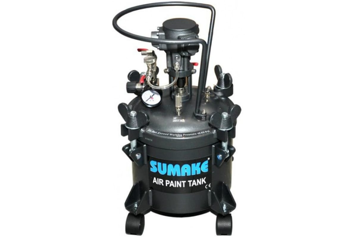 Красконагнетательный бак SUMAKE АТ-10A 35088 служит для подачи лакокрасочных, защитных, антикоррозийных материалов к распыляющим устройствам. Благодаря автоматической системе перемешивания предотвращается расслоение ЛКМ по плотности. Внутренний резервуар бака сделан из нержавеющей стали, что обеспечивает долгий срок службы. Агрегат оснащен регулятором давления воздуха и манометром.