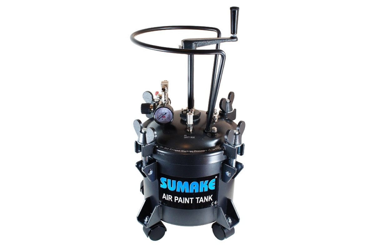 Красконагнетательный бак SUMAKE AT-10M 11227 предназначен для окрасочных работ. Он оснащен устройством для механического перемешивания лакокрасочных материалов. Внутренний резервуар выполнен из нержавеющей стали, благодаря чему рассчитан на длительный срок эксплуатации. Для точной настройки давления предусмотрен специальный регулятор и манометр.