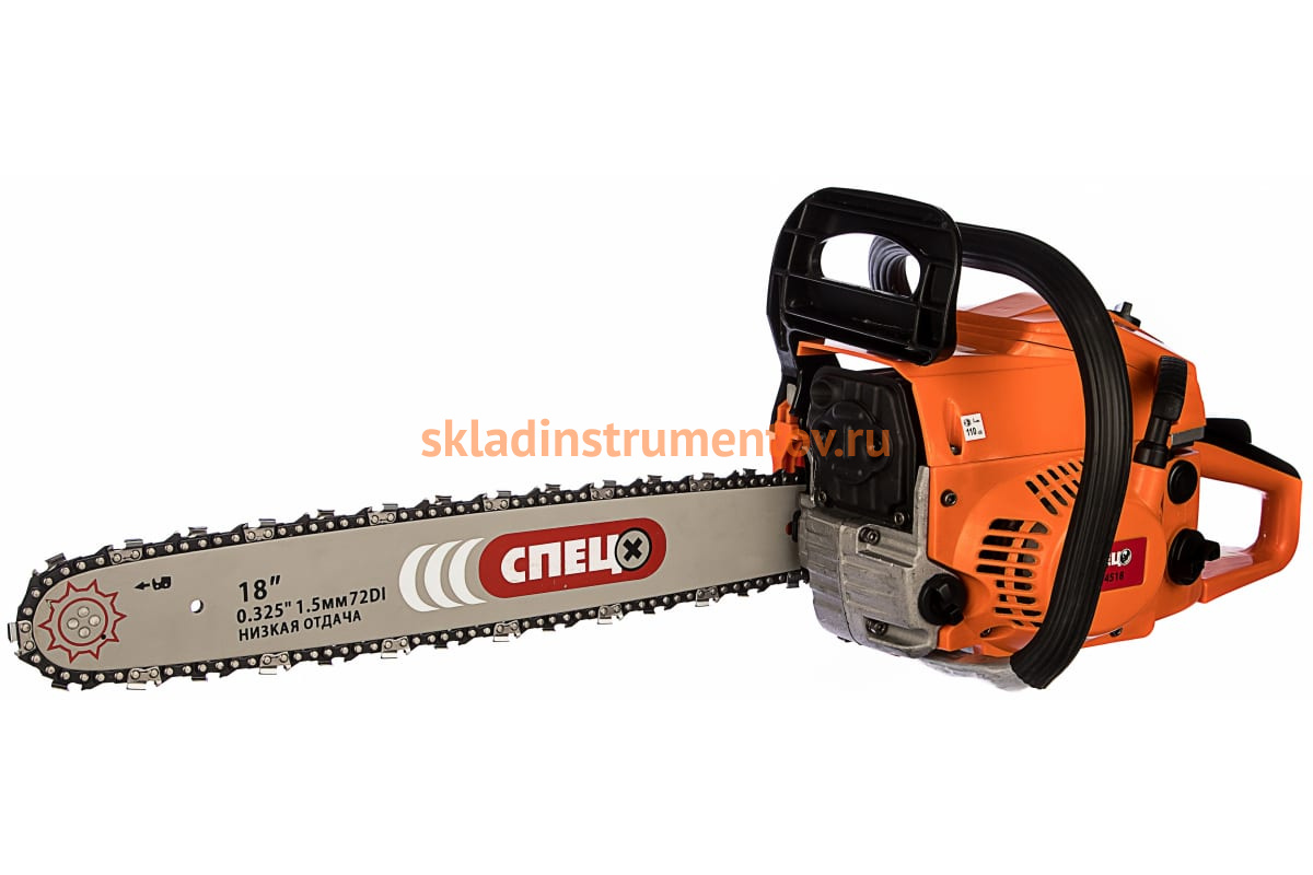 Цепная бензиновая пила СПЕЦ БП-4518 характеризуется высокой мощностью и производительностью. Отлично подходит для валки небольших деревьев, заготовки дров и обрезки веток на садовом участке. Металлический зубчатый упор гарантирует аккуратный распил.
