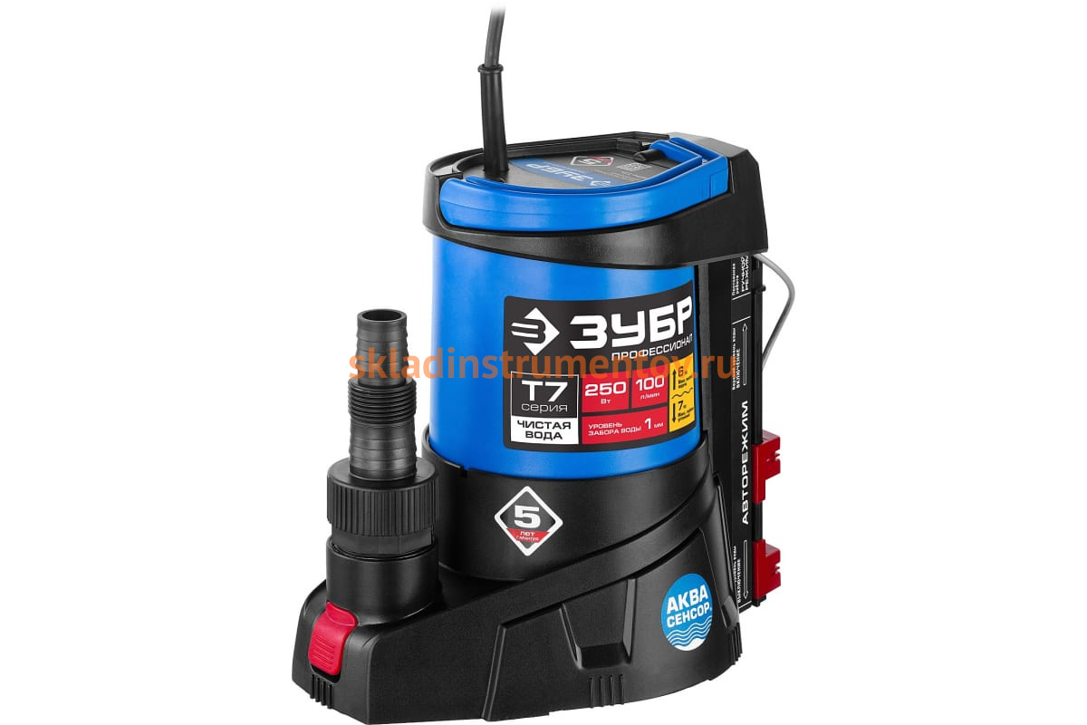 Погружной дренажный насос для чистой воды Зубр Профессионал Т7 АкваСенсор НПЧ-Т7-250 перекачивает воду из колодцев, выкачивает воду из бассейнов и резервуаров. Практически досуха собирает оставшуюся жидкость. Имеет режимы работы: ручной и автоматический.