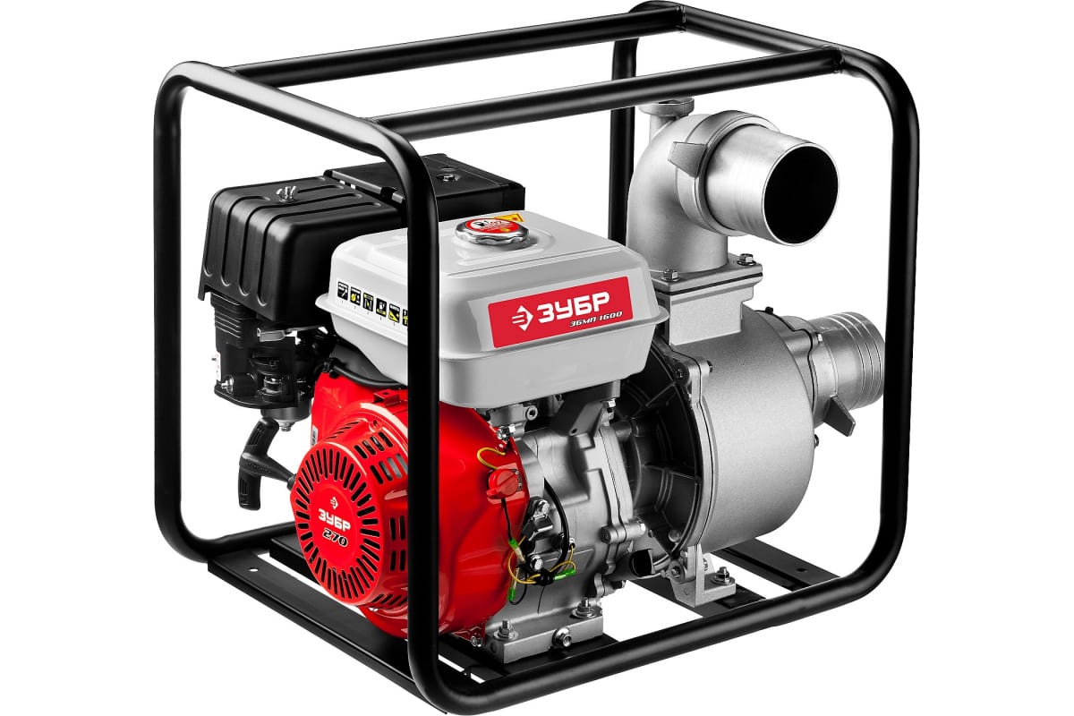 Мотопомпа ЗУБР ЗБМП-1600 - агрегат, предназначенный для использования в садово-огородных хозяйствах, на строительных площадках для откачивания и перемещения чистой или слабозагрязненной воды (диаметр твердых частиц не должен превышать 15 мм). Помпа оснащена 4-тактным двигателем, способным передавать жидкость на расстояние до 28 м. На одной заправке агрегат может отработать порядка 3 часов.