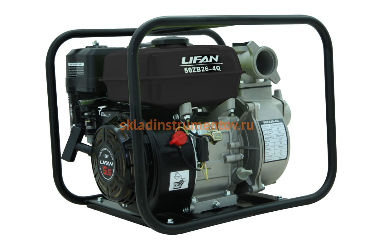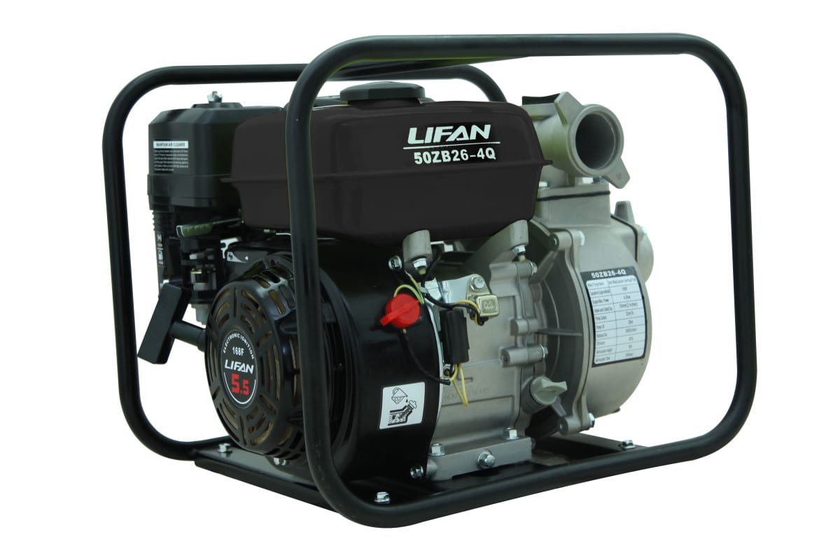 Мотопомпа LIFAN 50ZB26-4Q 00-00000050 оборудована бензиновым мотором мощностью 5.5 л.с. Способна перекачивать большой объем чистой воды. Устойчива на любой поверхности. Металлическая рама защищает свое содержимое от механических повреждений.