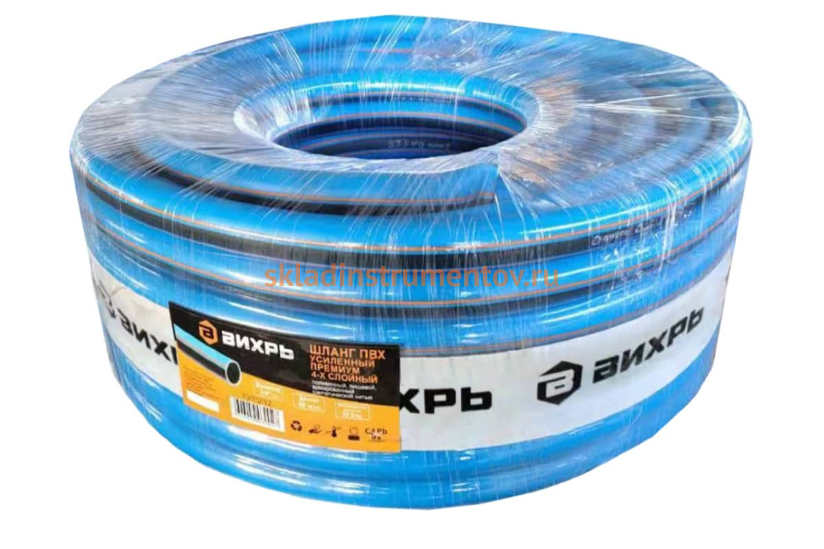 Поливочный армированный шланг Вихрь ПВХ усиленный премиум, 3/4", 50 м 73/7/2/12 используется для полива и орошения растений. Изготовлен из качественного ПВХ с армированием синтетической нитью. Не подвержен воздействию УФ излучения.