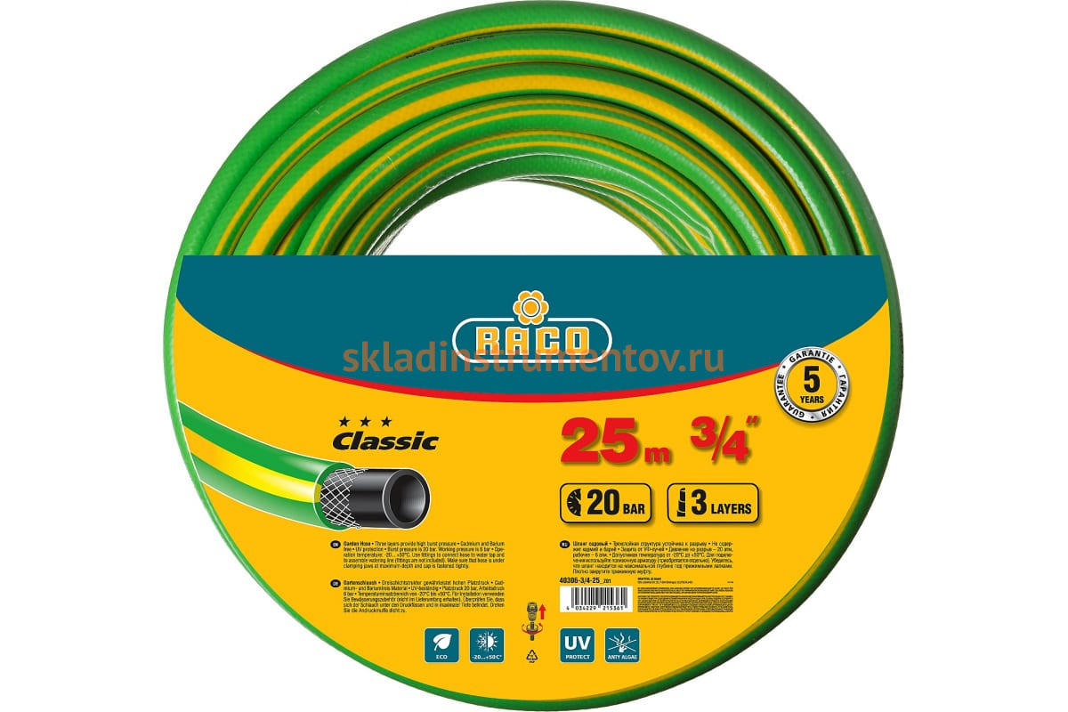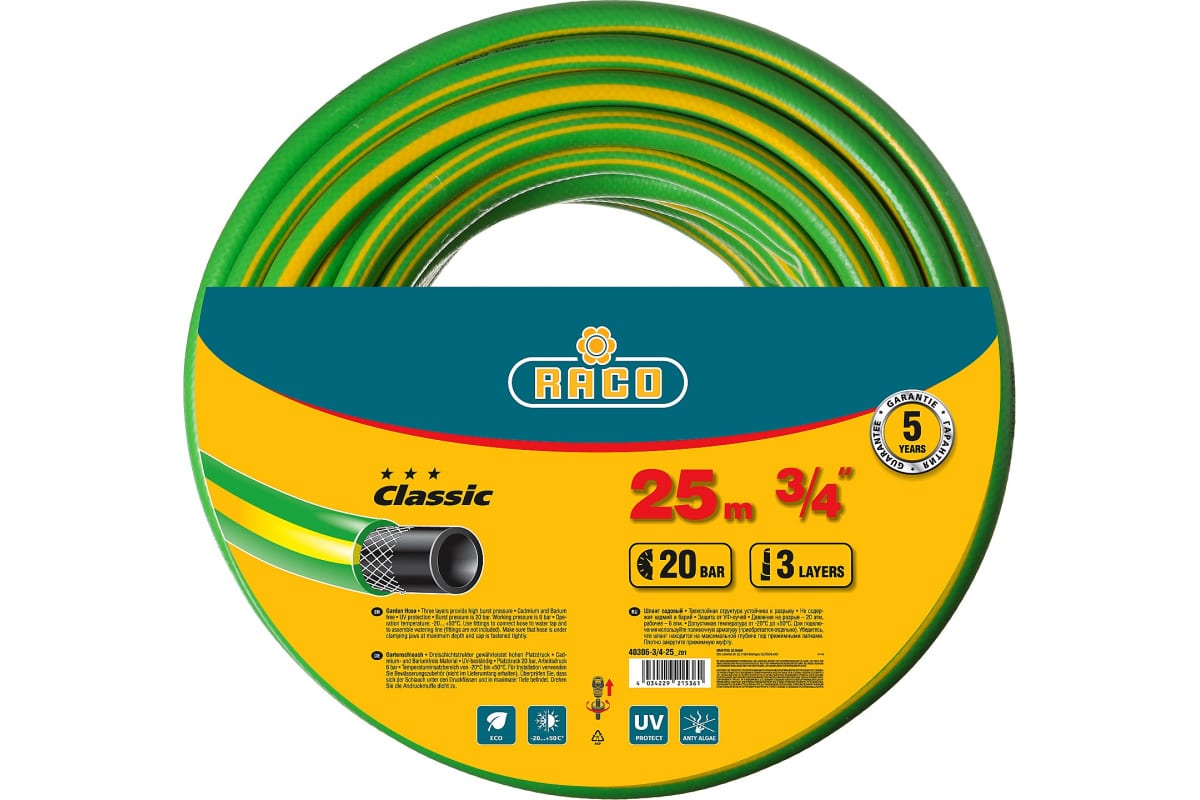 Поливочный армированный 3-х слойный шланг Raco CLASSIC 3/4"x25м 40306-3/4-25_z01 используется совместно с садовой техникой.