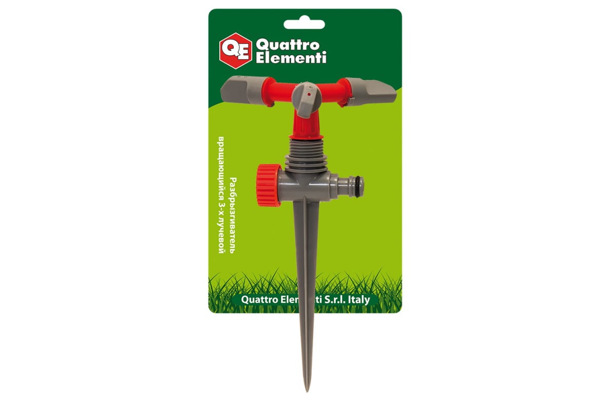 Разбрызгиватель QUATTRO ELEMENTI 241-376 является составной частью быстросъемной соединительной системы QUATTRO ELEMENTI и используется для орошения земельных участков. Приспособление оснащено штырем для установки в почву и изготовлено из пластика. Три вращающихся сопла осуществляют равномерный круговой полив сада. Подключается к шлангу с помощью соединителя, который приобретается дополнительно.