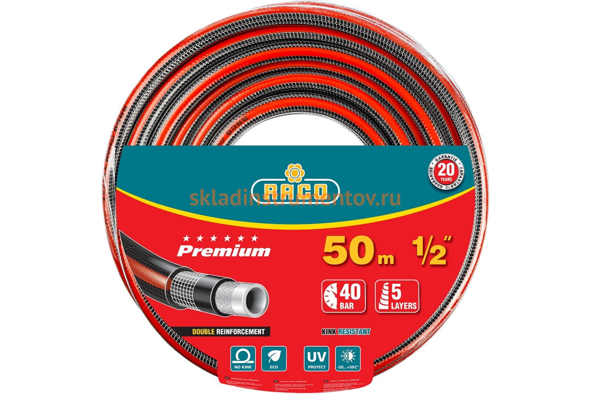 Поливочный армированный 5-ти слойный шланг Raco PREMIUM 1/2"x50м 40300-1/2-50_z01 предназначен для подачи воды к месту полива.